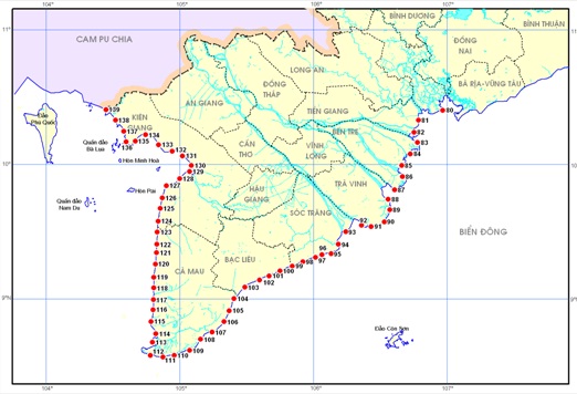 Phạm vi tính toán và xây dựng đường tần suất mực nước tổng hợp do thủy triều và nước dâng do bão dải ven biển nam bộ từ thành phố Hồ Chí Minh đến Kiên Giang thể hiện trong Hình 1, gồm 60 điểm với khoảng cách trung bình giữa các điểm khoảng 9 km.