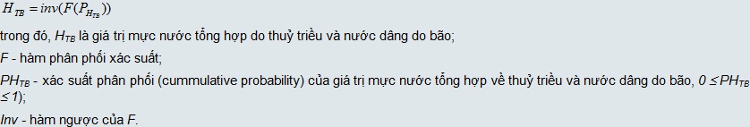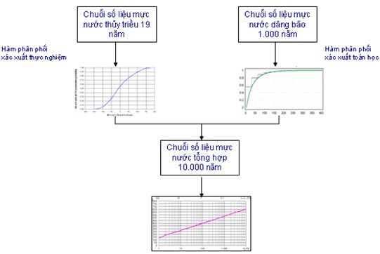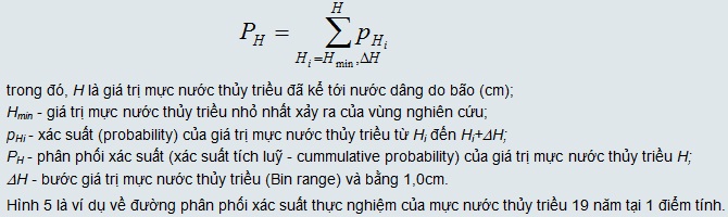 Hình 1. Vị trí các điểm tính và xây dựng đường tần suất mực nước tổng hợp Sử dụng chuỗi số liệu giá trị thủy triều từng giờ trong 19 năm (1991-2010) và chuỗi số liệu gồm 2.656 giá trị nước dâng do bão cực đại của 1.000 năm bão giả định để xác định độ cao mực nước, từ đó xây dựng đường tần suất mực nước tổng hợp do thủy triều và nước dâng do bão theo sơ đồ trong Hình 2. Hình 2. Sơ đồ khối xây dựng đường tần suất mực nước tổng hợp do thủy triều và nước dâng do bão Giá trị thủy triều từng giờ được tính toán trên cở sở tổ hợp của 10 sóng triều thành phần M2, S2, O1, K1, N2, K2, P1, Q1, Sa và Ssa theo công thức: trong đó, A0 là giá trị tham chiếu đến số “0” lục địa; qi, Hi, gi – vận tốc góc, biên độ và pha của sóng triều thành phần thứ i; fi, V0 và u – các tham số thiên văn. Các hằng số điều hòa tại các điểm ven bờ nhận được từ mô hình tính thủy triều Biển Đông với lưới tính có độ giải 1/12 độ kinh-vĩ. Mô hình này đã được hiệu chỉnh kỹ qua các số liệu đo đạc thủy triều tại các trạm hải văn dọc ven biển vùng nghiên cứu [2]. Giá trị mực nước dâng cực đại do 2.656 cơn bão giả định gây ra được tính toán bằng mô hình tính toán nước dâng do bão phát triển tại Viện Cơ học. Chương trình tính toán này đã được hiệu chỉnh và kiểm tra trước khi áp dụng cho vùng biển này [1]. II.2 Xác định hàm phân bố thống kê cho chuỗi dữ liệu nước dâng do bão Tại mỗi điểm tính, chuỗi số liệu nước dâng do bão (2.656 giá trị, tương ứng với 1.000 năm bão) sẽ được so sánh với các hàm phân bố thống kê toán học thường được sử dụng cho các hiện tượng cực trị (Hàm Gamma, GEV (Generalized Extreem Value), Generalized Logistic, Generalized Paretro, Log-Normal, Log-Logistic, Log-Pearson type III) để xác định hàm phân bố phù hợp nhất bằng phần mềm thống kê BestFit của Palisade Corporation. Tiêu chí lựa chọn hàm phân bố phù hợp nhất là: (1) tiêu chuẩn “Anderson-Darling” [5] và (2) quan sát mức độ phù hợp giữa biểu đồ của hàm phân bố lựa chọn và biểu đồ đường phân bố thực nghiệm. Đối với hàm phân phối xác suất độ lớn nước dâng bão, với dữ liệu của 1.000 năm bão, tại hầu hết các điểm tính, rất khó tìm được hàm phân bố toán học đơn (một hàm) mô tả đủ tốt. Do vậy, trong nghiên cứu này đã kết hợp 3 hàm phân bố (Hình 4). Hình 3. Hàm phân phối xác suất toán học nước dâng do bão tại 1 điểm tính Hình 4. Đường tần suất nước dâng do bão II.3 Xây dựng đường phân phối xác suất thực nghiệm của chuỗi dữ liệu mực nước thủy triều Chu kỳ 19 năm được xem là dài nhất của thủy triều tại khu vực nghiên cứu và chuỗi số liệu thủy triều 19 năm đã bao gồm cả giá trị thủy triều cao nhất và thấp nhất. Do vậy, đường phân bố thực nghiệm được sử dụng thay cho hàm phân bố xác suất thống kê thông thường để tránh việc tạo ra các giá trị mực nước thủy triều không có thực vượt ra ngoài khoảng giá trị thủy triều 19 năm. Tại mỗi điểm tính, đường phân phối xác suất thực nghiệm (empirical cummulative probability) của chuỗi số liệu mực nước thủy triều (175.296 giá trị cho từng giờ từ 0h ngày 1/1/1991 đến 23h ngày 31/12/2010) được xây dựng bằng phần mềm MS Analysis ToolPark – MS Excel với bước giá trị mực nước thủy triều (Bin range) là 1,0cm: Mực nước thủy triều (cm) II.4 Xây dựng đường tần suất mực nước tổng hợp do thủy triều và nước dâng do bão Thời gian đổ bộ của bão và chu kỳ thủy triều được xem là hoàn toàn độc lập với nhau. Một cơn bão đổ bộ vào có thể ở bất cứ pha triều nào: do triều cường, triều kiệt,… Do vậy, một giá trị mực nước tổng hợp do thủy triều và nước dâng bão là tổ hợp hoàn toàn ngẫu nhiên và độc lập của một giá trị nước dâng do bão và một giá trị mực nước thủy triều. Để có được giá trị mực nước tổng với tần suất xuất hiện chu kỳ dài (100 và 200 năm) đạt độ chính xác cao, phương pháp Monte-Carlo đã được sử dụng và 26.560 giá trị mực nước tổng hợp về thủy triều và nước dâng do bão tương ứng với tình huống 10.000 năm bão đã được mô phỏng: Giá trị mực nước thủy triều được xác định trực tiếp từ đường phân phối xác suất thực nghiệm tương ứng bằng phương pháp tuyến tính cục bộ (Piecewise linear) với xác suất P được lấy ngẫu nhiên trong khoảng 0-1 theo phân bố đều (uniform distribution). Ví dụ trong hình 6, giá trị mực nước thủy triều có xác suất 0,77 là 53cm. Hình 6. Xác định mực nước thủy triều HTr từ giá trị xác suất phân phối P Tại mỗi điểm tính, chuỗi số liệu mực nước tổng hợp do thủy triều và nước dâng do bão (26.560 giá trị tương ứng với tình huống 10.000 năm bão) sẽ được so sánh với các hàm phân bố thống kê toán học thường được sử dụng cho các hiện tượng cực trị để xác định hàm phân bố phù