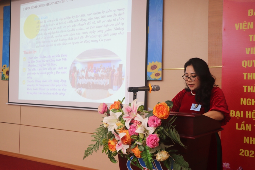 Đồng chí Nguyễn Thu Thảo - Chủ tịch Công đoàn cơ sở Khối cơ quan Viện nhiệm kỳ 2022 - 2025 báo cáo tổng kết của Ban chấp hành Công đoàn Cơ quan Viện nhiệm kỳ 2022 - 2025 và phương hướng hoạt động, nhiệm vụ nhiệm kỳ 2025 - 2030