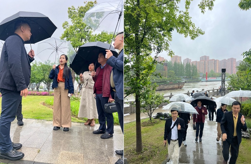 Tiếp tục hành trình Đoàn đến tham quan công trình bờ kè kết cấu toàn bộ bằng cọc ván thép tại cửa sông Trường Giang. Kè dài 6km một bên, tổng 12km hai bên, khởi công năm 2019, hoàn thành năm 2020. Đoạn kè được thi công tại điểm giao cắt giữa Kênh Đại Vận Hà Bắc Kinh - Hàng Châu và sông Trường Giang (Dương Tử) có điều kiện dòng chảy, giao thông thuỷ quan trọng của vùng, điểm trung chuyển hàng hóa giữa vùng kinh tế trọng điểm hạ lưu sông Trường Giang và các tỉnh phía Bắc.