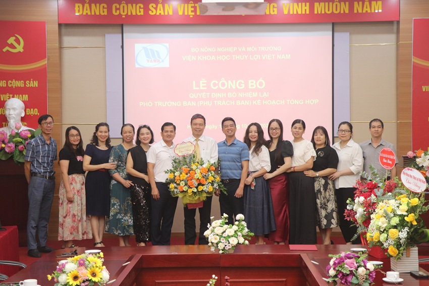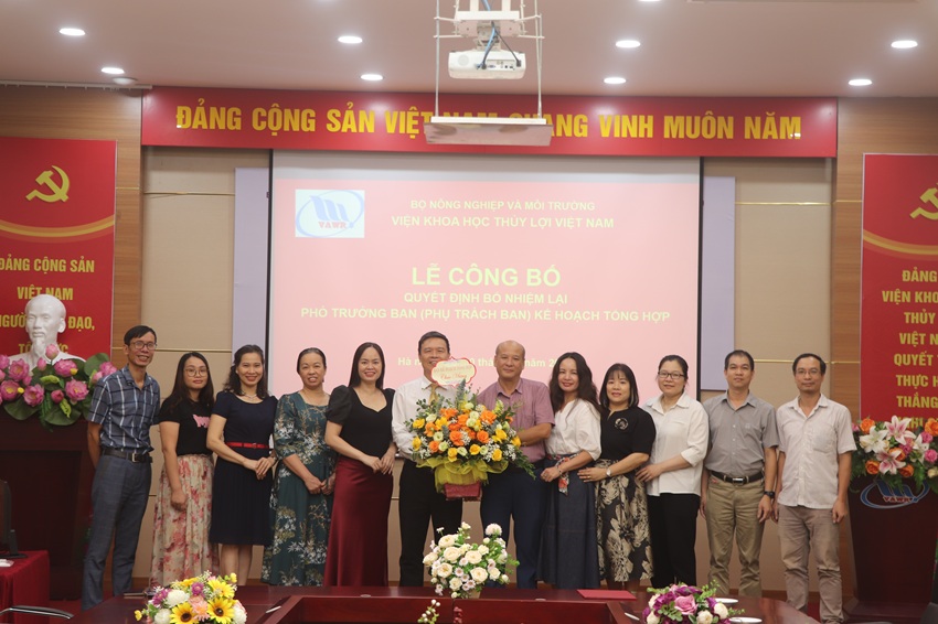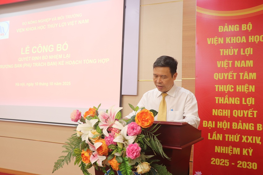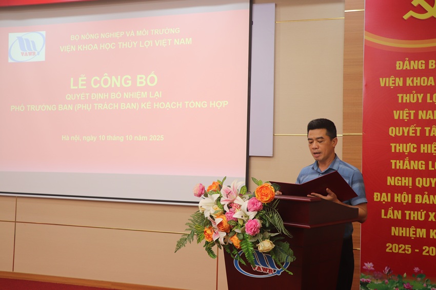 Tại buổi lễ, Đồng chí PGS.TS. Đặng Hoàng Thanh - Trưởng Ban Tổ chức Hành chính đã công bố quyết định số 666/QĐ-VKHTLVN ngày 09/10/2025 của Giám đốc Viện Khoa học Thủy lợi Việt Nam về việc bổ nhiệm lại có thời hạn ông Phạm Văn Ban tiếp tục giữ chức Phó Trưởng Ban Kế hoạch, Tổng hợp trực thuộc Viện Khoa học Thủy lợi Việt Nam, kể từ ngày 12/10/2025 cho đến thời điểm đủ tuổi nghỉ hưu theo quy định. Ông Phạm Văn Ban có trách nhiệm tiếp tục thực hiện nhiệm vụ phụ trách Ban Kế hoạch, Tổng hợp.
