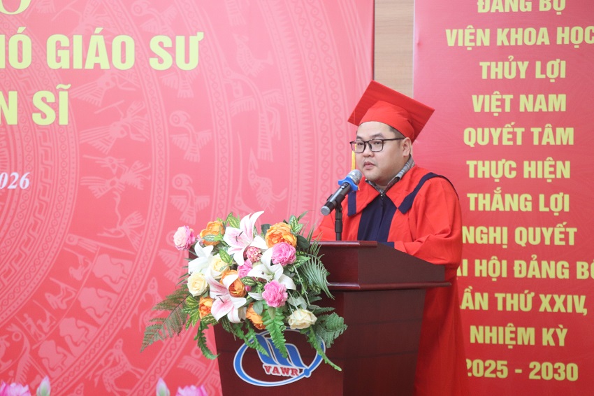Phát biểu tại buổi lễ, GS.TS. Trần Đình Hòa - Bí thư Đảng ủy - Giám đốc Viện khẳng định đào tạo, bồi dưỡng, phát triển nguồn nhân lực, đặc biệt nguồn nhân lực chất lượng cao Giáo sư, Phó Giáo sư, Tiến sĩ luôn là nhiệm vụ ưu tiên hàng đầu của Viện Khoa học Thủy lợi Việt Nam. Viện Khoa học Thủy lợi Việt Nam luôn luôn khuyến khích, tạo mọi điều kiện tốt nhất cho các NCS, các ứng viên Phó Giáo sư, Giáo sư.