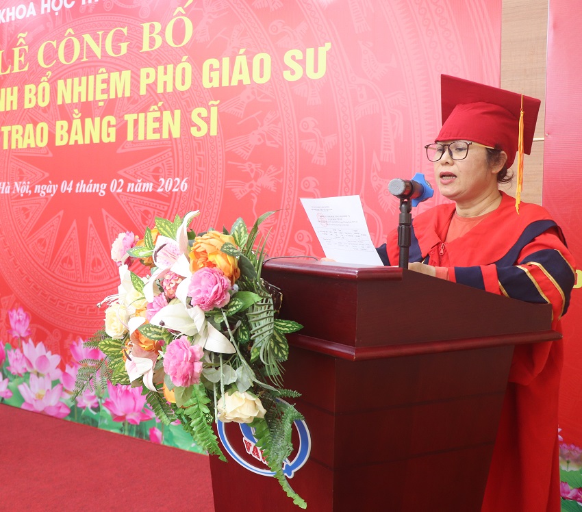 Cũng tại buổi lễ, thừa lệnh của Thủ trưởng cơ sở đào tạo, thay mặt đơn vị quản lý nhiệm vụ đào tạo trình độ tiến sĩ, PGS.TS. Phạm Hồng Cường công bố 04 Quyết định công nhận học vị và cấp bằng TS cho NCS. Phạm Đức Hưng (Quyết định số 535/QĐ-VKHTLVN ngày 05/8/2025); NCS. Bùi Văn Hữu (Quyết định số 536/QĐ-VKHTLVN ngày 05/8/2025); NCS. Mai Trọng Luân (Quyết định số 69/QĐ-VKHTLVN ngày 30/1/2026) và NCS. Trần Văn Nguyên (Quyết định số 70/QĐ-VKHTLVN ngày 30/1/2026).