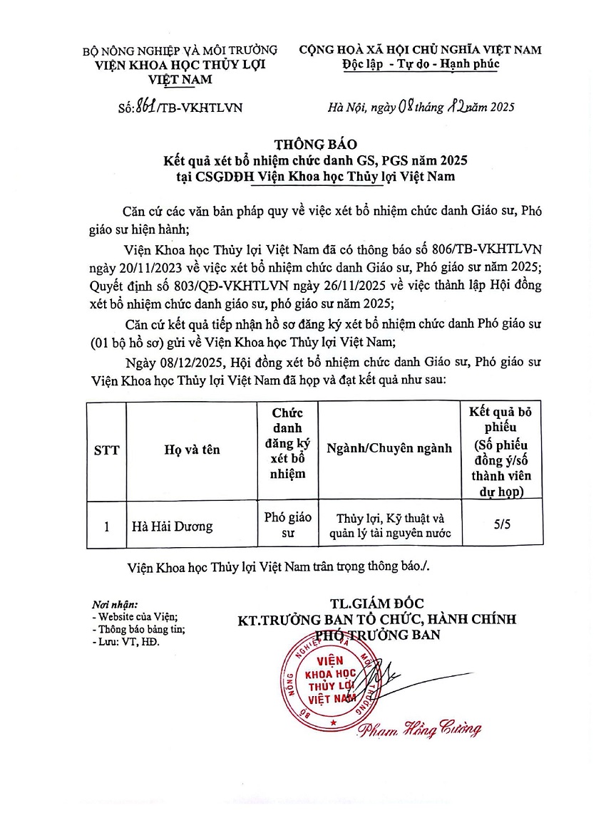 Thông báo kết quả xét bổ nhiệm chức danh GS, PGS năm 2025 tại CSGDĐH Viện Khoa học Thủy lợi Việt Nam
