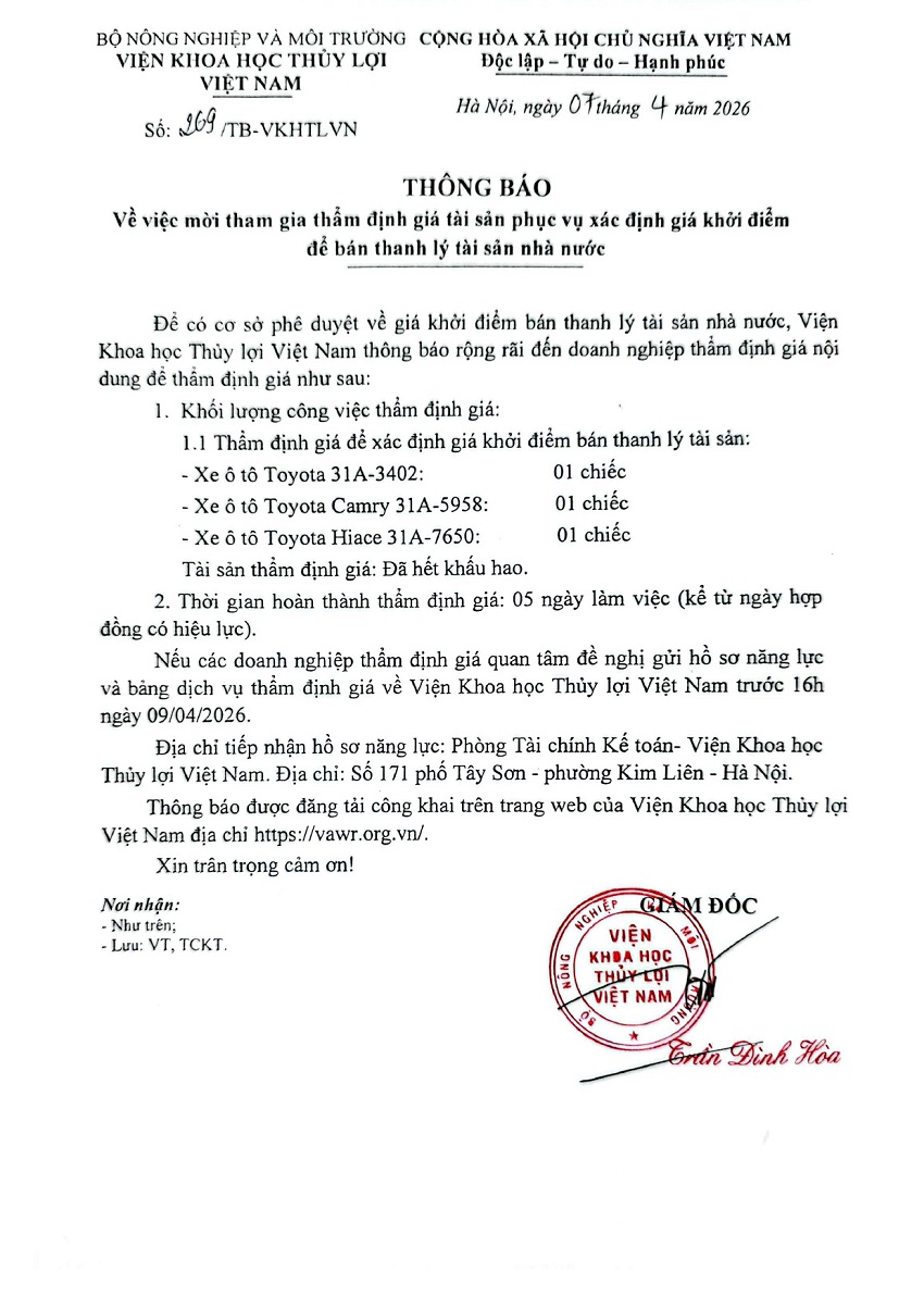 Thông báo về việc mời tham gia thẩm định giá tài sản phục vụ xác định giá khởi điểm để bán thanh lý tài sản Nhà nước