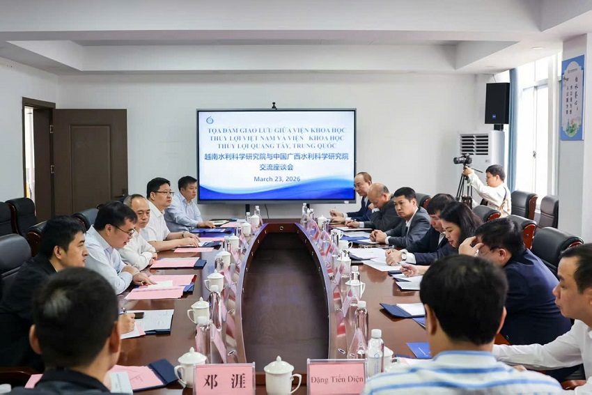 Trong khuôn khổ chuyến công tác tại thành phố Nam Ninh (Khu tự trị dân tộc Choang Quảng Tây, Trung Quốc), ngày 23/3/2026, Đoàn công tác của Viện Khoa học Thủy lợi Việt Nam (VAWR) do GS.TS. Trần Đình Hòa – Giám đốc Viện dẫn đầu đã có buổi tọa đàm, giao lưu khoa học với Viện Khoa học Thủy lợi Khu tự trị Dân tộc Choang Quảng Tây (GIWRR).