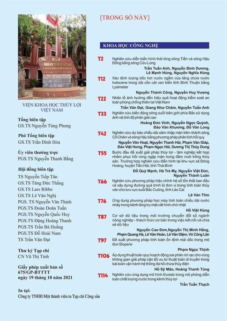 42 | Nghiên cứu dự báo chiều dài xâm nhập mặn trên nhánh sông Cổ Chiên và sông Hậu bằng phương pháp phân tích hồi quy | Nguyễn Văn Hoạt, Nguyễn Thanh Hải, Phạm Văn Giáp, Đào Việt Hưng, Phạm Ngọc Hải, Dương Thị Thùy Dung | Nghiên cứu xâm nhập mặn nói chung và dự báo xâm nhập mặn nói riêng đóng vai trò quan trọng đối với sản xuất và dân sinh vùng Đồng bằng sông Cửu Long (ĐBSCL). Nghiên cứu này tập trung vào dự báo mặn cho tỉnh Vĩnh Long, sử dụng các số liệu quan trắc mặn, dòng chảy và thủy triều để phân tích, dự báo chiều dài xâm nhập mặn lớn nhất trên sông Cổ Chiên và sông Hậu. Bằng phương pháp hồi quy lập các công thức tính dự báo chiều dài xâm nhập mặn lớn nhất tương ứng với tuần triều cao trong tháng (1 tháng có 2 tuần triều cao), việc tính toán dự báo được thực hiện từ tháng 1 đến tháng 5. Kết quả đánh giá số liệu thực đo và số liệu dự báo cho thấy kết quả tính toán các chuỗi số liệu có hệ số tương quan từ 0,5 – 0,9 cho tất cả các đợt triều cao tính toán. Riêng các năm đại diện 2020 và 2021, kết quả có hệ số tương quan từ 0,7 – 0,9. Từ khóa: Đồng bằng sông Cửu Long, xâm nhập mặn, nguồn nước, phân tích hồi quy, chiều dài xâm nhập mặn lớn nhất, năm đại diện |